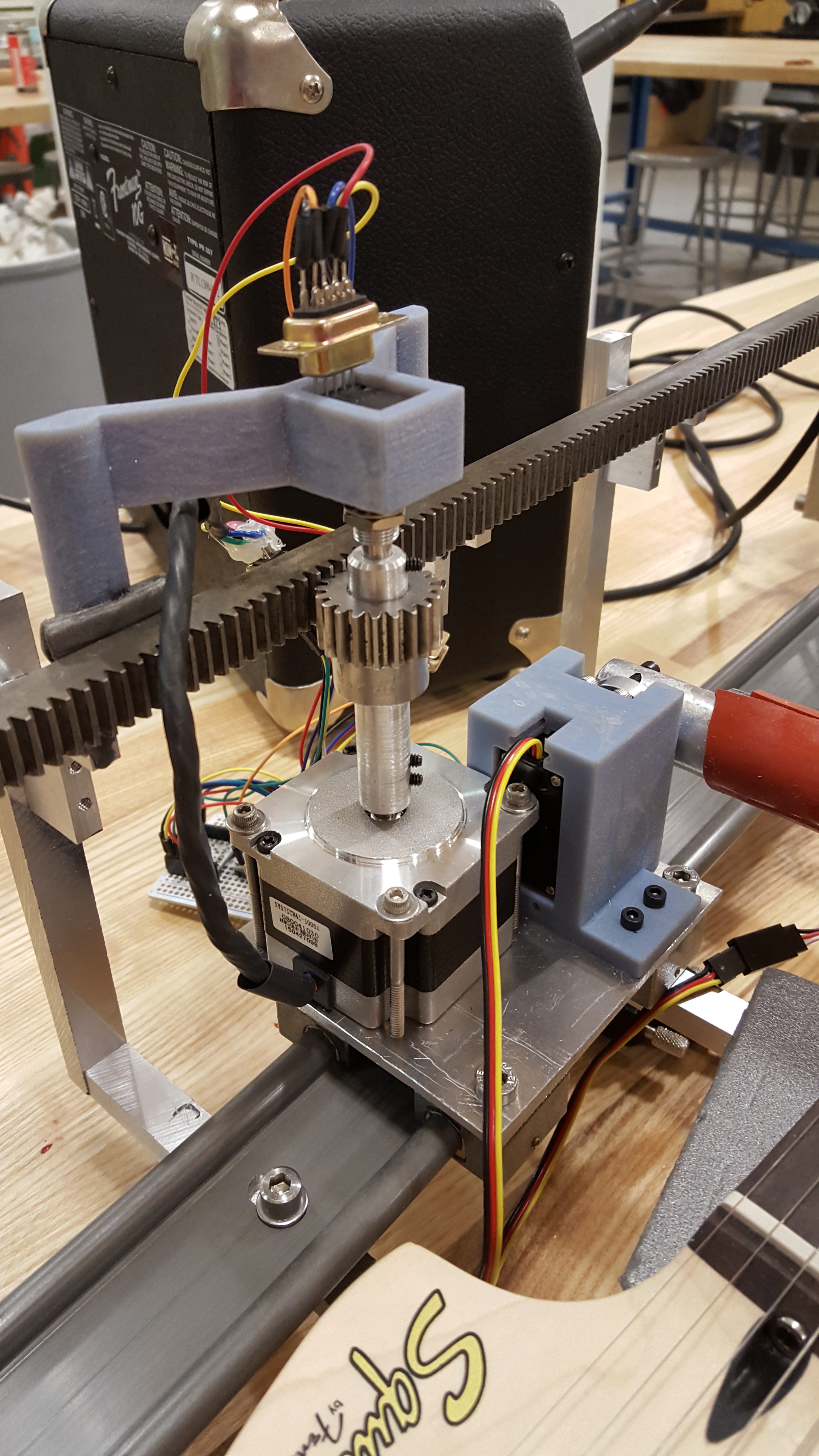 When we reworked Cithara, we made several major changes to the design of our system. The pulley system for our initial slider design was created hastily. The 3D-printed parts and fish wire were not very reliable or accurate. We switched these out for a stepper motor with an encoder on a rack and pinion system. This allowed for a higher level of precision and speed in the slider system movement. Moreover, the guitar slide itself was mounted on a servo that allowed for more control over its calibration with the guitar. The robotic arm was also upgraded by doubling the servos at each joint for significantly improved precision and the adjustable gripper was switched out for a custom clamp to better hold the guitar pic. Furthermore, the system was operated by an Adruino Mega and an Arduino Uno.