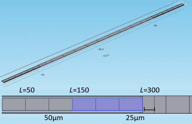 Numerous finite element simulations were run prior to the fabrication of new polysilicon MEMS devices. Forces were applied at symmetrical segments to model the electrostatic capacitive forces. The load is always enough to pull the center 30nm in the negative z direction.The small fingers are where the devices is anchored and the blue indicates where forces are acting. Here L is a measure of where force is applied from either end toward the center. We found that when L>350 μm, the mirror is convex and when L<325 μm it is concave. Between that range, the simulation suggests that the mirror is flat.