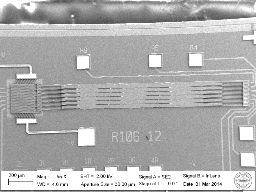To see if this design was scalable, we began testing an array of 6 mirrors using both the chevron actuator and the pads to flatten the device. Additional simulations and tests were run to find the optimal flattening positions.