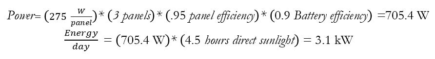 Three 1x1.65m, 275W monocrystalline solar panels are sufficient to power the motor. Based on the calculations below, we can charge our 6kWh batteries in less than two days. However, the required amount of surface area required for the panels does not scale with the size of the vessel. For a vessel larger than 12m, 24kWh are required which roughly translates into a solar panel surface are of 19.25m^2. This indicates our solution is only valid for small vessels.
