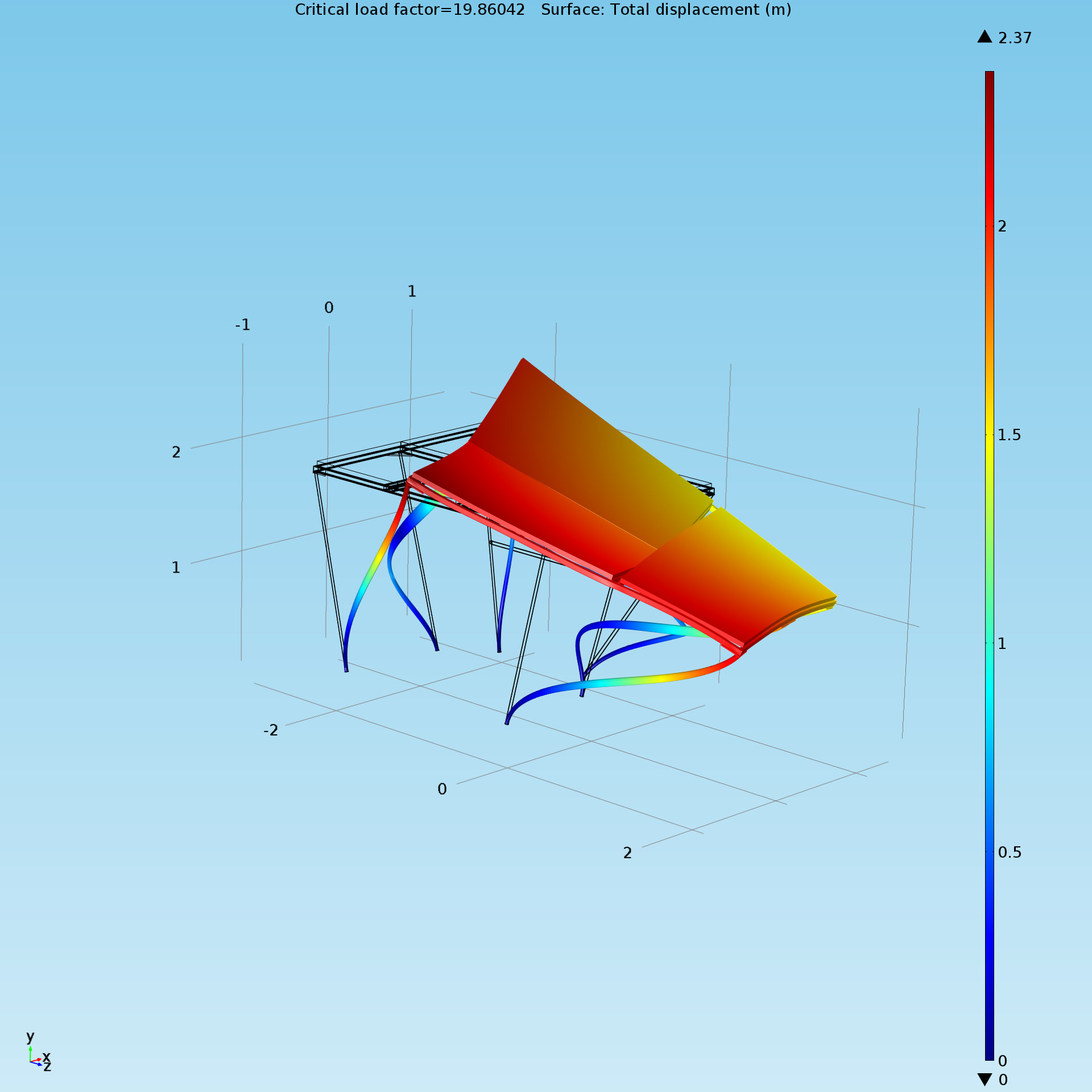The figure below shows the results of a buckling load simulation, which calculates the load when the poles of the truss fail and illustrates how they deform. The structure rotates towards one corner as it collapses due to the asymmetrical arrangement of the solar panels. Fortunately, the buckling load of the poles is approximately 19 times higher than the load occurring in Beaufort Force 9 winds. This indicates that it is unlikely for the truss itself to fail if the boat experiences severe wind and weather conditions.